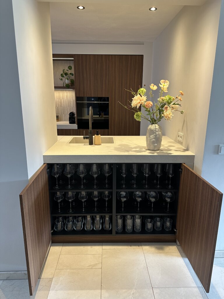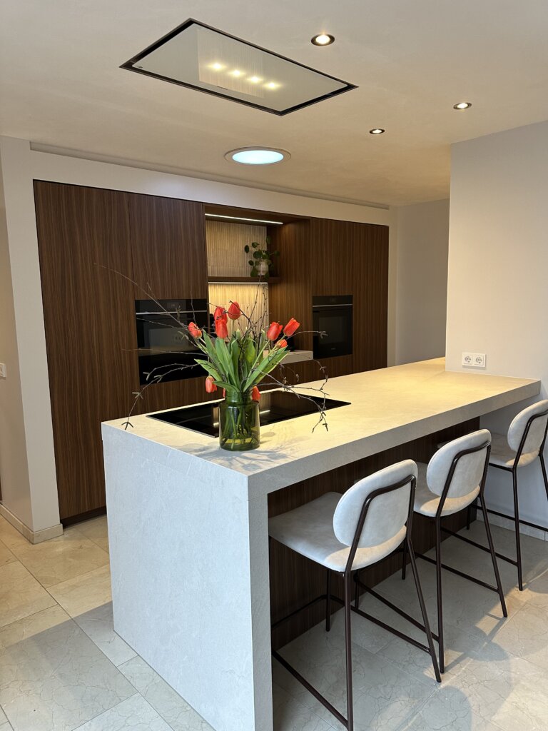 Het royale kookeiland vormt het hart van de keuken en nodigt uit tot samenzijn. Het lichte werkblad contrasteert prachtig met de warme houttinten van de fronten, waardoor een tijdloos en elegant geheel ontstaat. Naast uitstraling stond gebruiksgemak centraal. Het eiland biedt voldoende werkruimte én een gezellige zitplek, zodat koken en samenzijn hand in hand gaan.